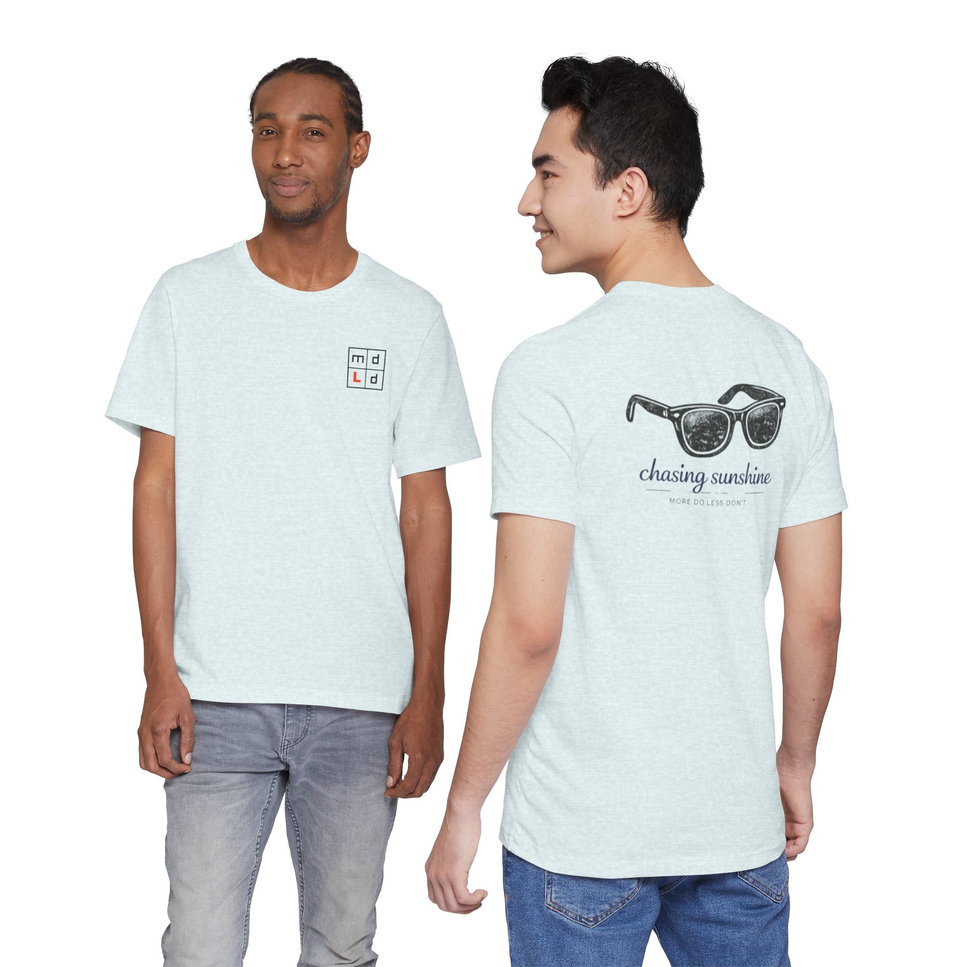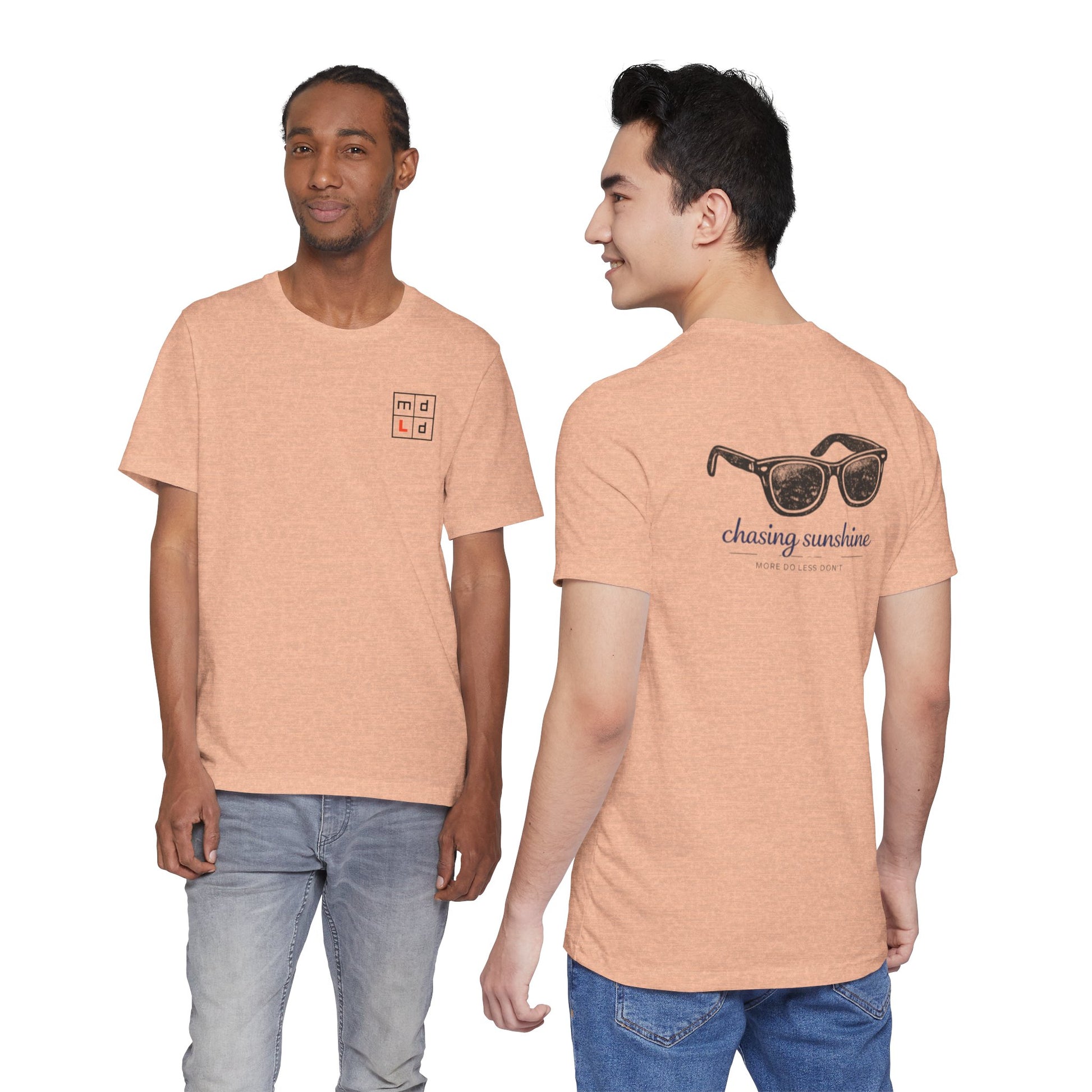 - Small back print: sunglasses graphic with scripted tagline; sleeve and label printing use DTF/DTG methods depending on provider